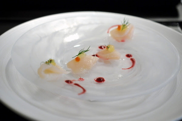 Modern Zukuri - Japanese Scallop with Bell Pepper Gelee, Golden Kiwi, Dill